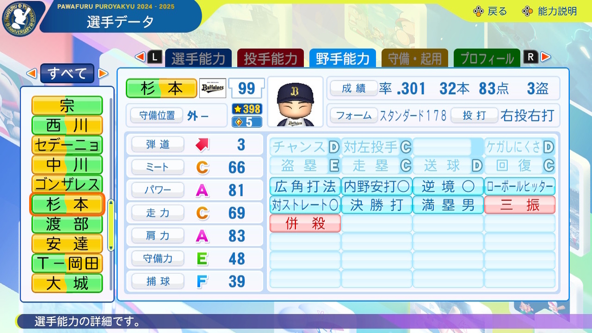 成績:打率 .301 32本塁打 83打点 3盗塁